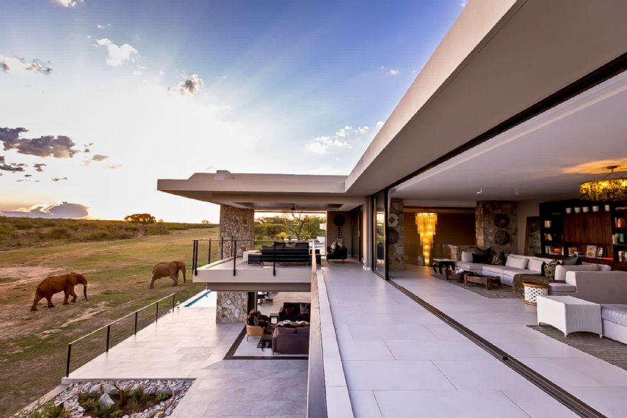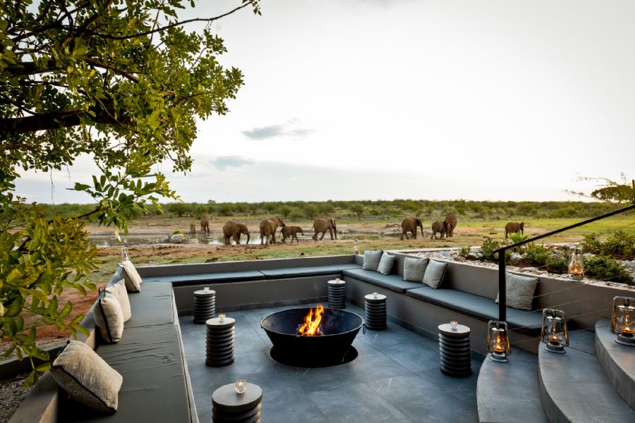 Relax while watching wild elephants play at a waterhole 20-meters away on a Jamala-coined