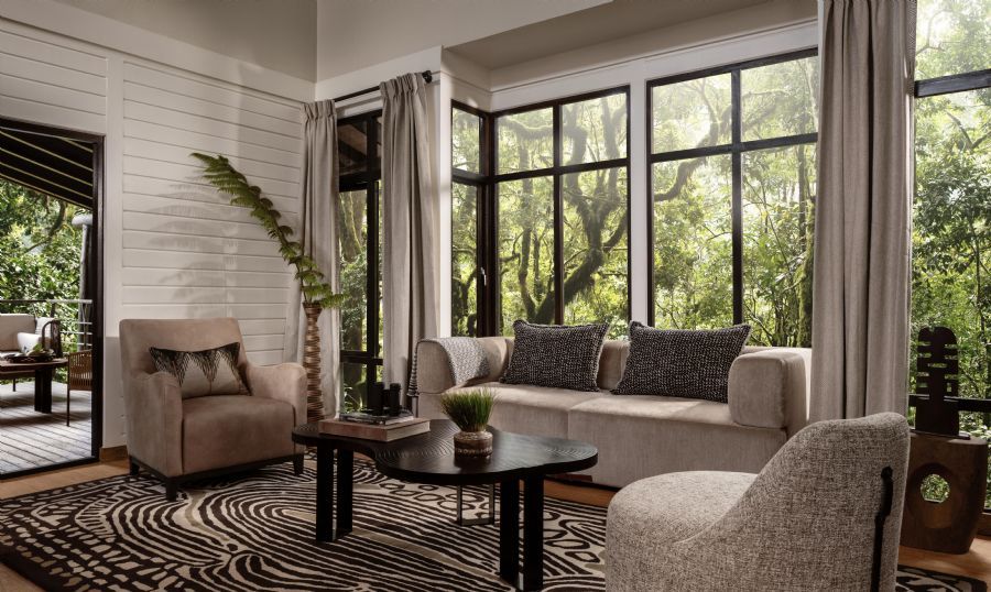 Nestled between lush rainforest and verdant tea plantations, the luxury Two-Bedroom Forest Suite offers warm, welcoming respite to adventurers. Two large bedrooms and airy living areas boasts plenty of space for family, friends and larger groups. The master bedroom boasts a four-poster king-sized bed, while the second bedroom includes double-sized twin beds. Both bedrooms offer their own wood-burning stoves and en suite bathrooms, plus private decks with hypnotic views. The bathrooms feature twin vanities, a walk-in shower, and a deep standalone bath. The spacious living room is beautifully fitted out with modern amenities, plush lounges, and a roomy dining table and fireplace.
