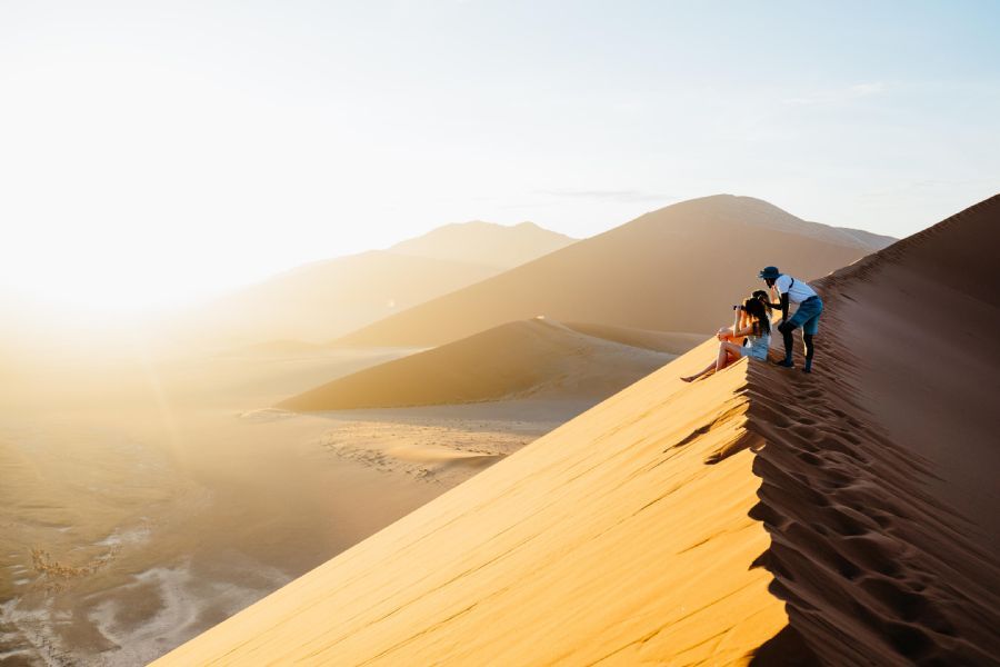 World-famous Sossusvlei is both the name for the area in general; as well as an enormous clay pan, flanked by immense sand dunes. Climb the 984-foot red dunes and gaze upon the famed Namib Sand Sea World Heritage Site. Nearby, at the foot of some of these dunes, the skeletons of 900-year old camelthorn trees dominate the landscape where once water flowed. This is known as Dead Vlei.