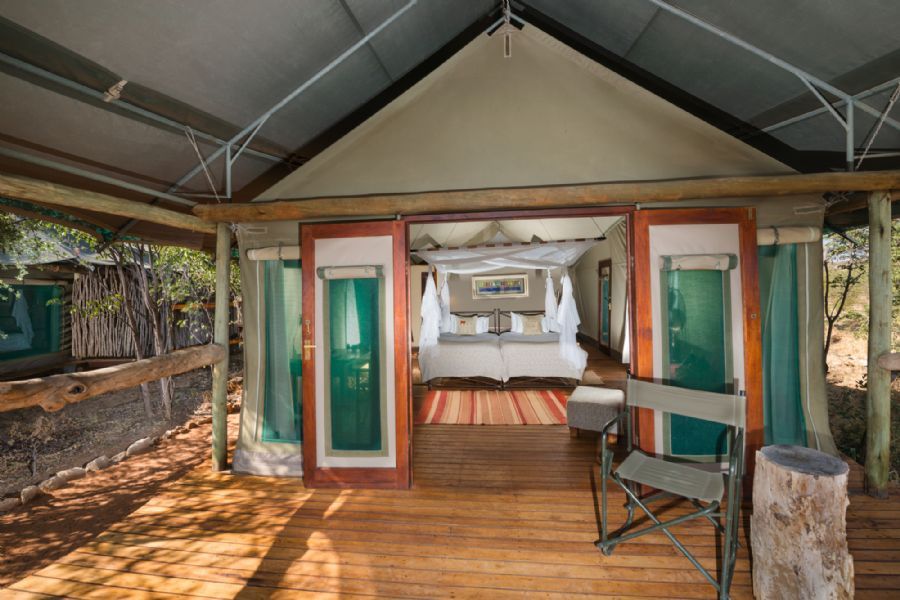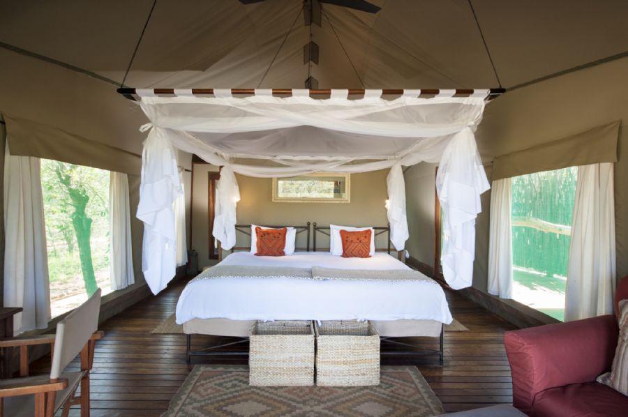 Eight en-suite canvas tents with double basins, plus indoor and outdoor showers, six of which are twin tents with two three quarter beds, one double tent with one queen-size bed and one family unit consisting of two identical bedrooms, each with two three quarter beds, and their own bathroom and entrance, linked by a short, curved walkway. The tents have a covered veranda, a safe, ceiling fans, mosquito net, tea/coffee and 220V power.