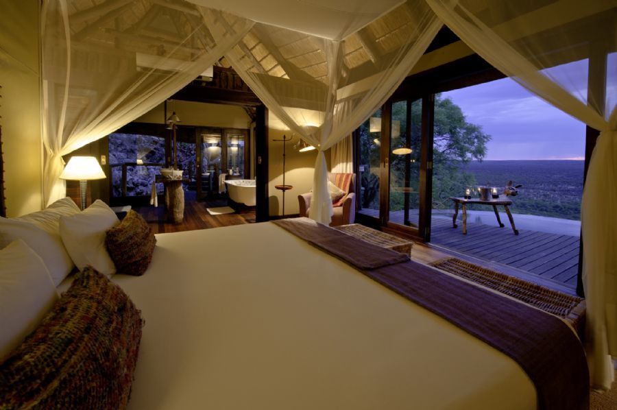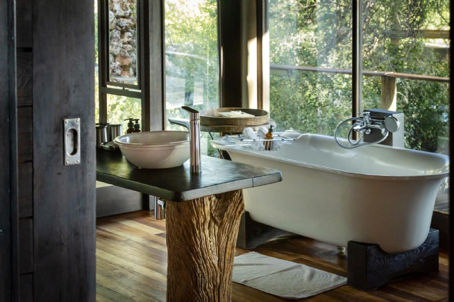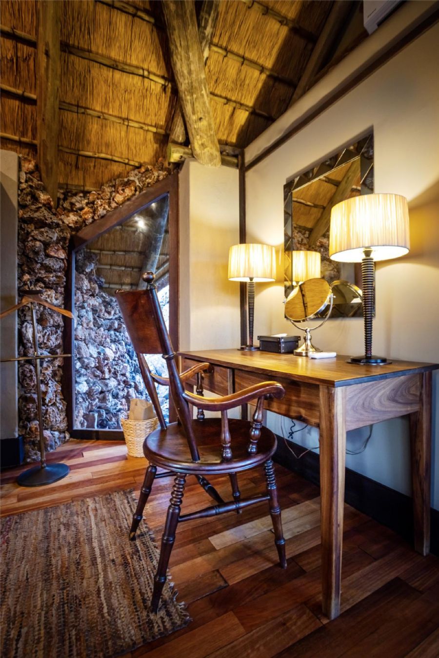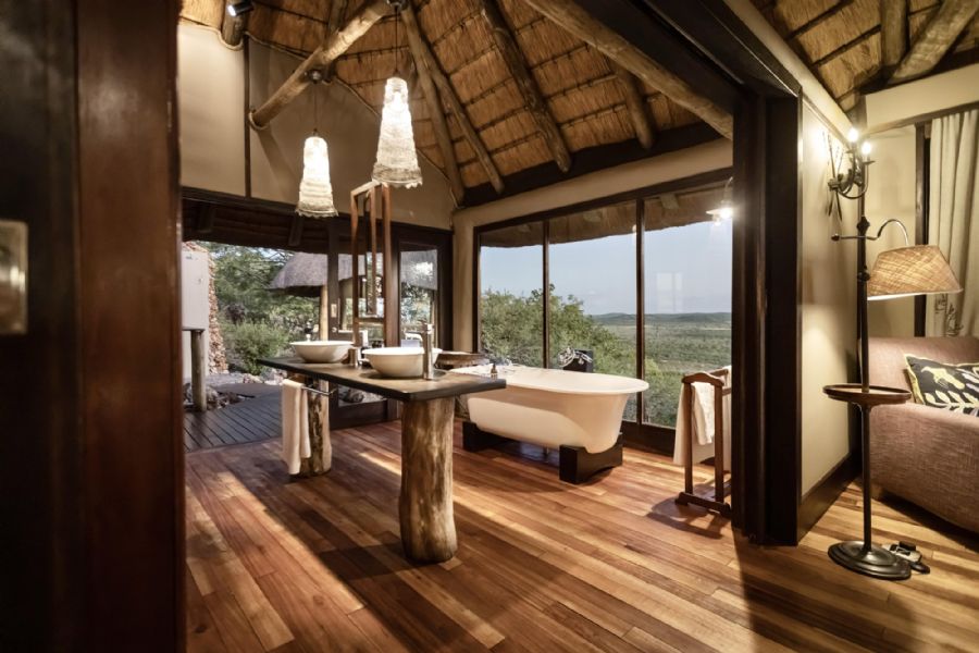 Three luxury en-suite villas with double basins and bathtub, plus indoor and outdoor showers, of which one luxury villa has a king-size bed and two luxury villas have two three quarter beds that can be converted into king-size beds. Each villa includes air conditioning in the rooms, sitting room and viewing deck, veranda, fireplace, bar-fridge, safe, tea/coffee, hairdryers and 220V power.