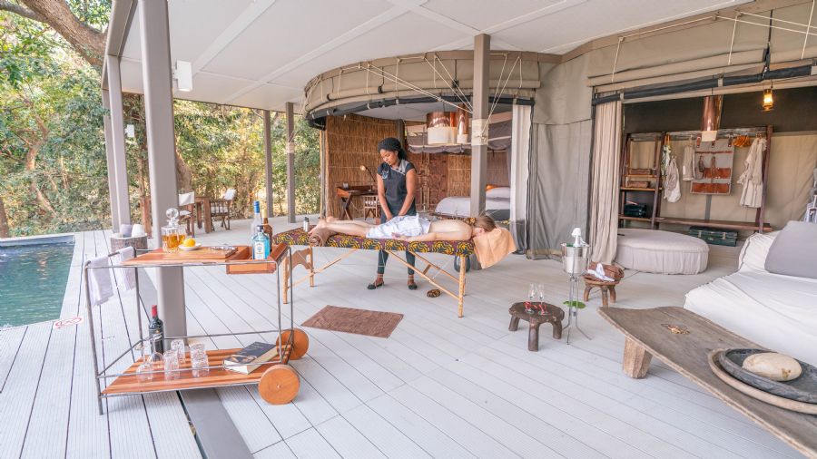 Situated on a sweeping curve of the Luangwa River, Time + Tide Chinzombo brings style and sophistication to the Luangwa Valley. This wildly luxurious camp retains its bush authenticity with grass and canvas walls, and spacious living areas that melt into the exquisitely tranquil riverside setting. Colonial accents complement organic textures, creating an authentic feel that harkens back to the early days of exploration. With soaking tubs and feathertop beds, every luxury safari tent is a haven for relaxation. Relax by your tent’s private pool, watching the river’s frequent wildlife visitors. Under the shade of ancient trees, listen to the bellows of hippos echoing across the river.