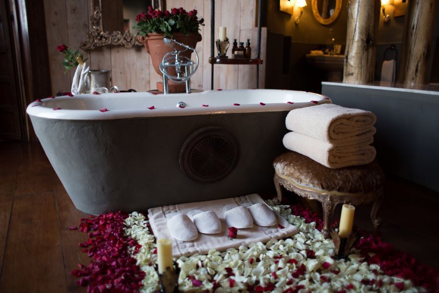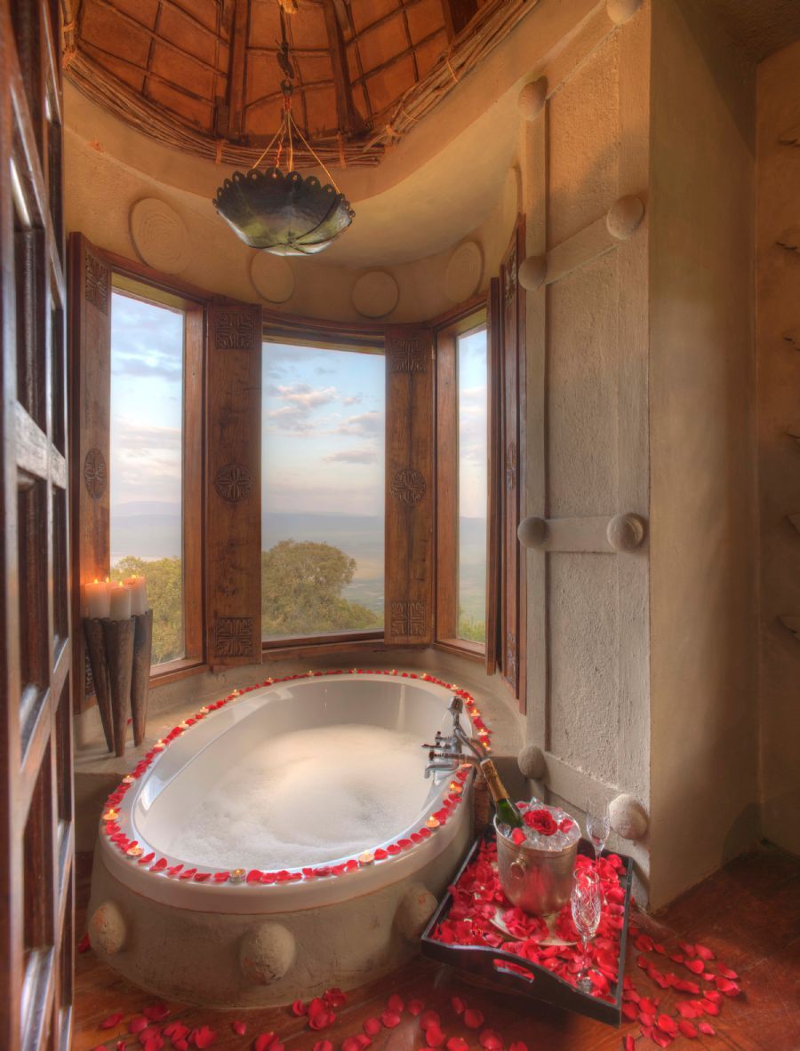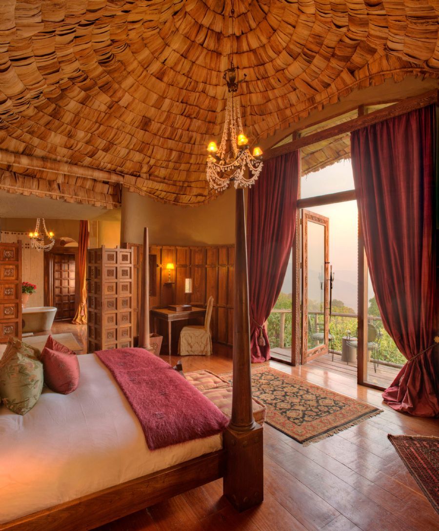Steeped in romance, each stilted, handcrafted mud and thatch suite is adorned with graceful antiques, grand chandeliers and elegant African treasures. The bedroom, sitting room and ensuite bathroom boast floor-to-ceiling glass windows overlooking the magnificent Crater below.