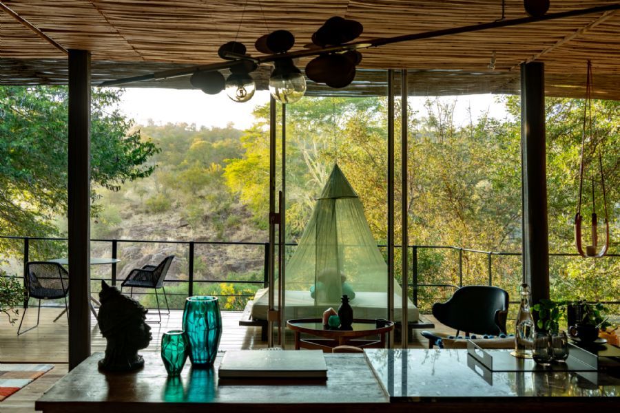 Sweni Lodge’s intimate riverside setting among tranquil trees in Singita’s private concession in the Kruger National Park invites continuous engagements with the natural surrounds. Each of its seven open-plan suites features outdoor showers, floor-to-ceiling glass doors opening onto expansive wooden decks, and daybeds that provide the option to fall asleep under a canopy of stars. Inspired by the striking colors of the region’s magnificent birds, chameleons and beetles, Sweni’s subtle sophistication is framed by beautiful bronze and gold finishes – and the main lodge area’s fire pit and Marble Bar make for magical evenings when the wilderness welcomes the sounds of the night.