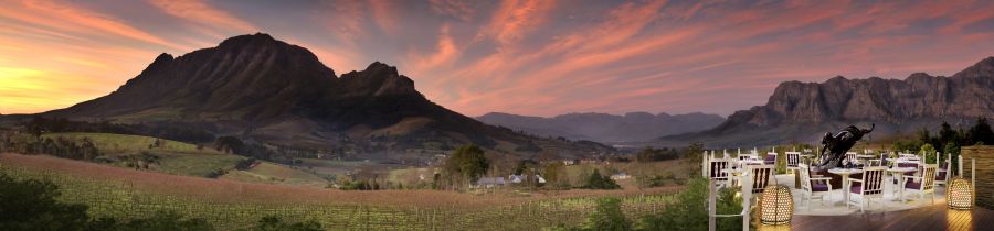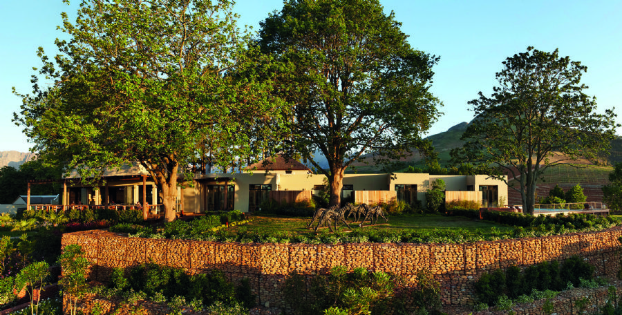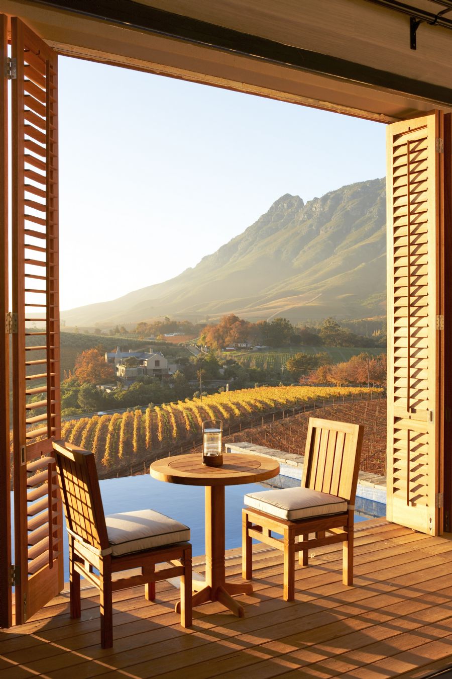 Located in mature gardens with running water in front of each lodge and wild jasmine, each lodge provides a sanctuary with glorious views either into the gardens or over the Stellenbosch winelands to Cape Town and the Atlantic Ocean.