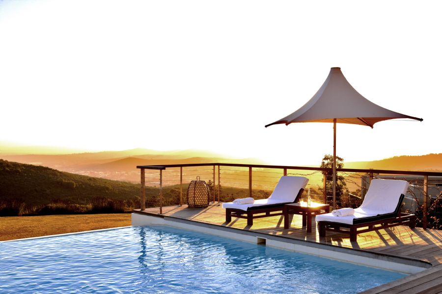 80 m² lodges with 1 bedroom, lounge, private infinity heated pool, butler’s kitchen and views of the Stellenbosch hills and valley, estate vineyards.