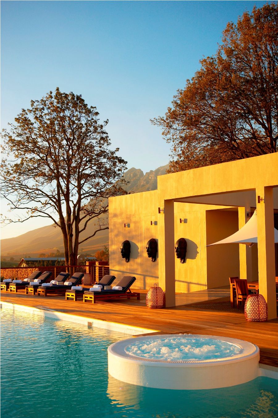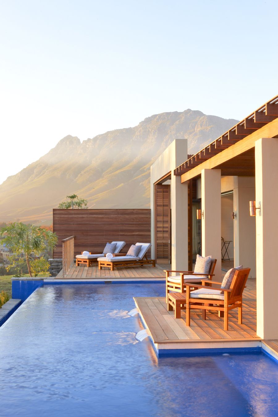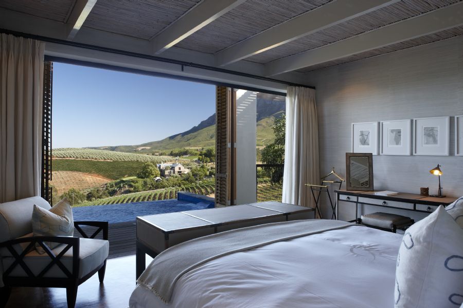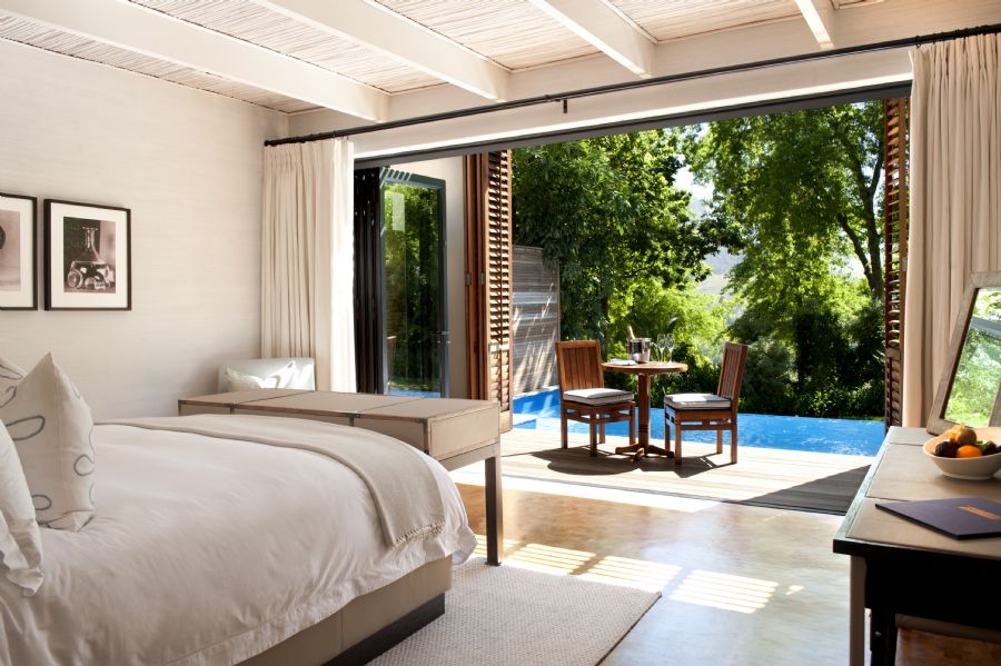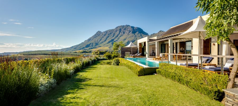 80 m² lodges with 1 bedroom, lounge, private infinity heated pool, butler’s kitchen and garden views towards the Simonsberg Mountain Range.