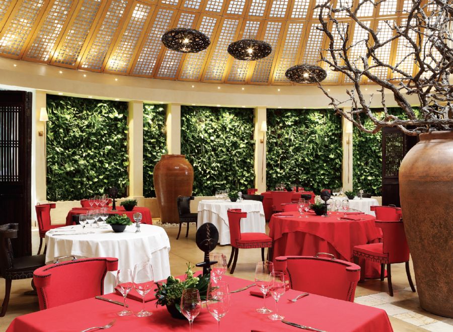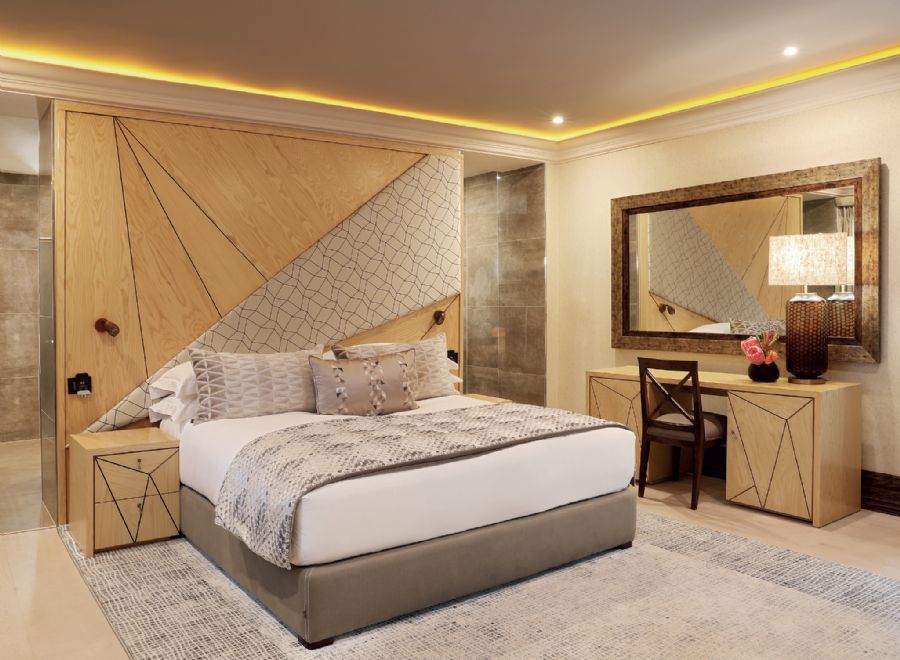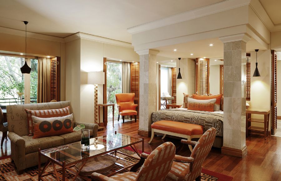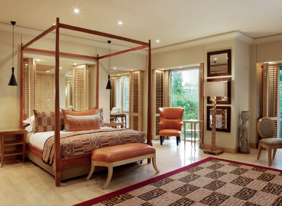 The stately African décor of this premier suite is the epitome of the style and elegance for which the Saxon is renowned. This stately suite features an entrance, guest bathroom, guest suite, separate lounge, dining room and business area with business desk. The master bedroom has a king size bed, separate bathroom with separate bath, walk-in shower and steam room. There is a fully equipped butler’s kitchen and 24-hour dedicated butler service. The suite offers views of the gardens and pool terrace.