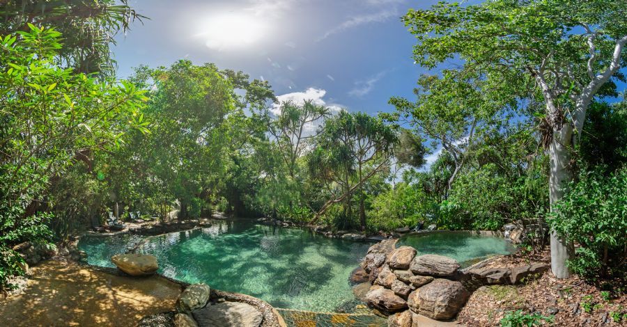 On a private peninsula surrounded by stretches of white beaches and dense rainforest teeming with life is Thala Beach Nature Reserve, which is located between Cairns and Port Douglas. The eco-friendly resort is spread out across 145 acres of protected natural area, ensuring that guests experience the unique and untouched ecosystem while conserving its fragile inhabitants. Beaches are quiet and clean, lined by ancient rainforests and mangroves while dolphins leap from the waters of the Great Barrier Reef. High grounds are home to tropical birds and butterflies, and at night, the Milky Way is visible from the resorts observatory. Suites and bungalows are scattered across the grounds and hidden away in manicured gardens, offering privacy, comfort and luxury. Sleep near the beach with calming ocean views or nestled in the jungle surrounded by the sounds of the forest. The main lodge, set among the eucalyptus, is home to the modern Australian restaurant, a free-form pool with hidden grottos and waterfalls and a relaxing massage studio.