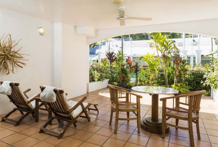 Our spacious Verandah King Rooms provide a truly tropical haven. These King bedded rooms have a stunning four poster king beds or individually carved bed heads, comfy linen armchairs with unique artwork and unique solid wooden coffee table. Separate luggage and vanity room in addition to a bathroom is perfect for couples. White plantation shutters open on to your private balcony or patio, complete with dining set, sun recliners and mini kitchenette.