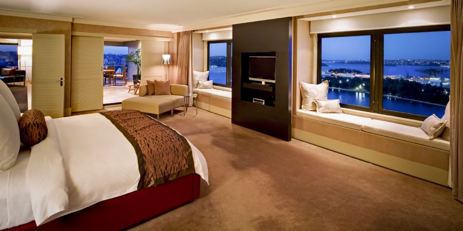 These rooms all sit above the 24th level of the hotel and as a result enjoy sweeping views over Sydney Harbour including the Opera House. Each Room has a window seat, high speed internet access, mini bar, cable television, en suite marble bathroom, chaise lounge, work desk with task lighting, dual telephone lines, safe, either one king bed or two double beds.