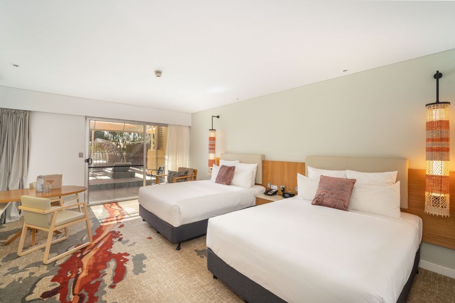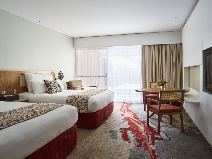 The Deluxe Spa Rooms have extended balconies with an open-air spa. The rooms are configured with a deluxe king or twin queen beds and include air-conditioning, TV, movies on demand, minibar and bathrobes are provided.