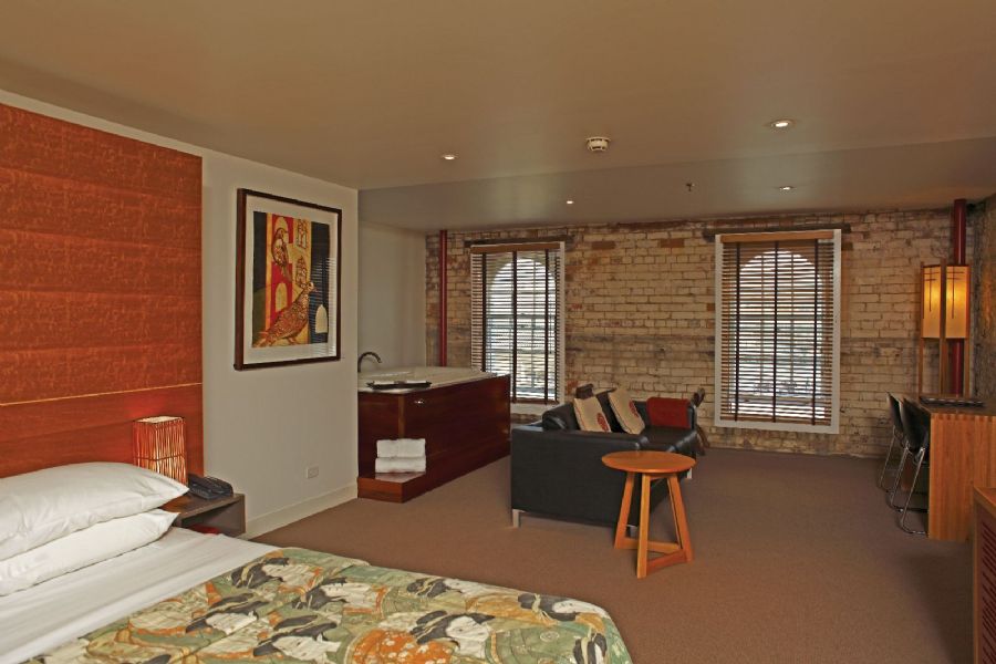 Deluxe Spa Harbour View RoomsThe Deluxe Spa Harbour View Rooms overlook the stunning harbor front of Hobart framed by the cityscape and Mount Wellington. These rooms feature original walls of stone and timber trusses, columns and beams that soar upwards to just beneath the roofline. With European style, stainless steel and translucent glass bathrooms these rooms include a Kohler elliptical spa for total relaxation.