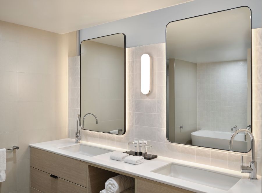 There's room to unwind in a two-bedroom Terrace Suite at the Reef View Hamilton Island, with a separate lounge, two bedrooms and the capacity to sleep six guests. The master bedroom has two queen beds and a spacious ensuite bathroom detailed in marble, with separate bath and shower. The second bedroom has one king bed (can be split into 2 single beds) and an en suite with shower. Relax in the living and dining room with its soft seaside décor, ocean views, cocktail bar and mini bar, and internet access. The suite’s lounge room and master bedroom each have a flat-screen TV with pay-to-view first-run movies. Room features at a glance.