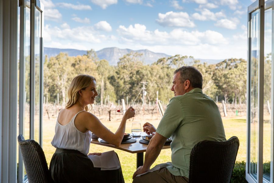 The restaurant overlooks the on-site vineyard with stunning views of the mountain range beyond.