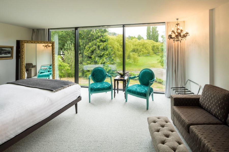 An indulgent, suite-style guest room with views across the parkland toward Queenstown’s Remarkables mountain range. These spacious rooms are self-contained with a kitchenette, and feature subtle chandelier lighting, a super king-size bed, a full-length gilt-edged mirror, a glass-walled bathroom with a free-standing bath and separate toilet.