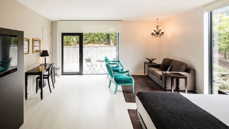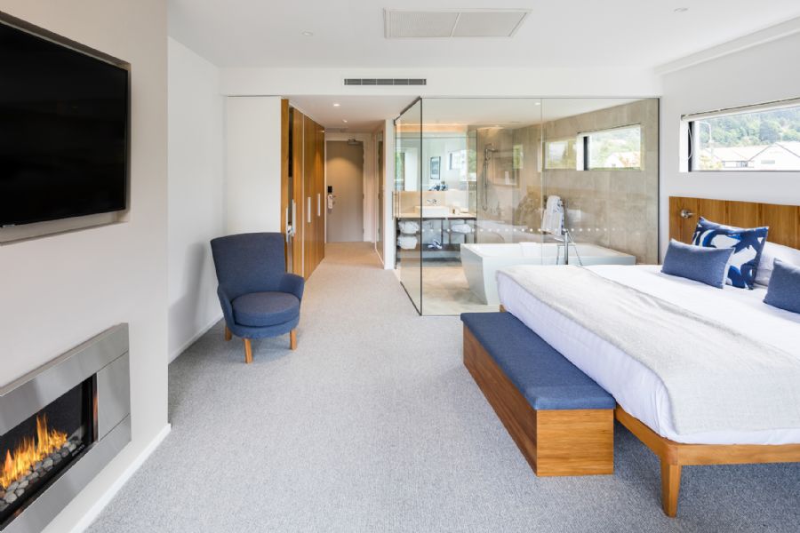 The most luxurious and spacious guest rooms. Stay in style surrounded by tasteful contemporary décor complemented by a cosy gas fire. Step outside onto the balcony to enjoy views of the nearby parkland and Queenstown’s iconic mountains. Guests enjoy the convenience of their own microwave, kettle and crockery, super king-size bed, generous wardrobe storage space, glass-walled bathroom with free-standing bath and a separate toilet room.