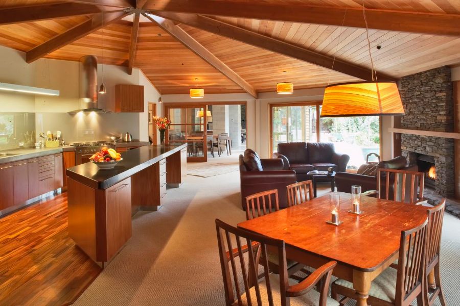 Within the main lodge area, French doors open onto a large expansive deck area where guests can enjoy the wider views of the lush Tongariro riverside environment, listen to bird songs and feel at peace. Our beautiful lodge has been awarded first place in a prestigious New Zealand Architectural competition, testimony to the quality and style of our accommodation and its surrounds.