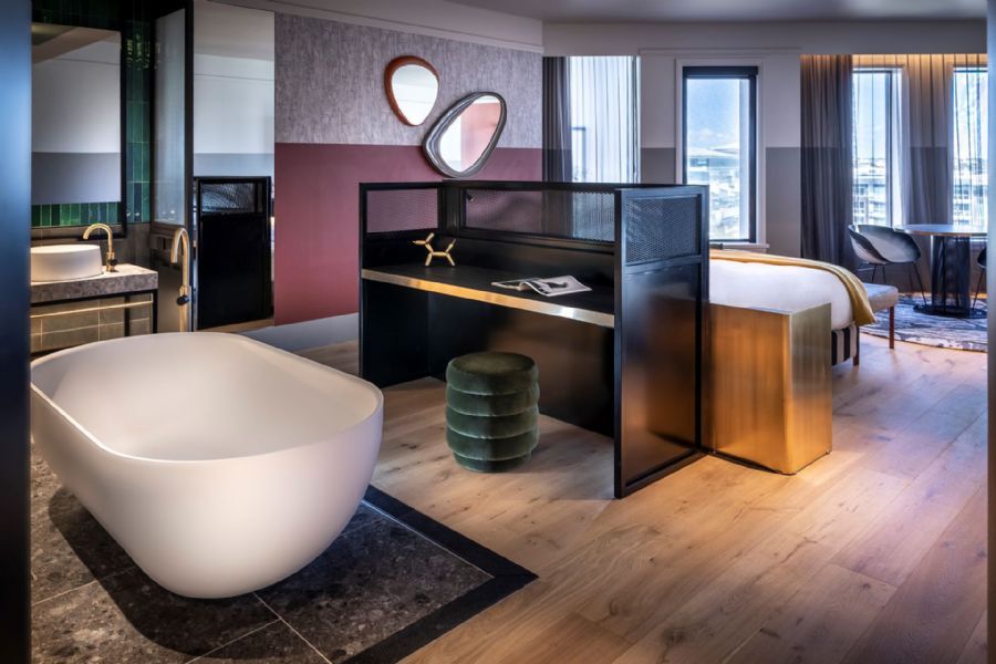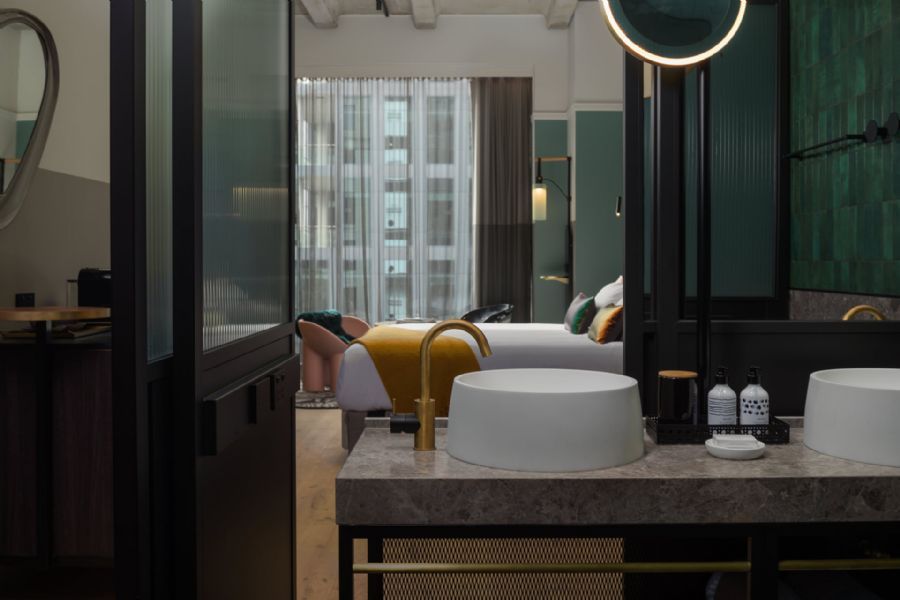 Designed by spying the sparkling harbor, QT Auckland took dramatic style notes from nature. Rare beauty is celebrated in bold design that’s strikingly off the wall. Drawing inspiration from the oyster and oyster trawler, designer Nic Graham has created a visual feast.