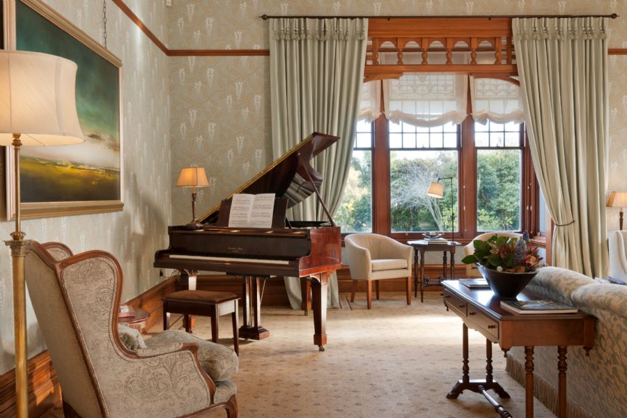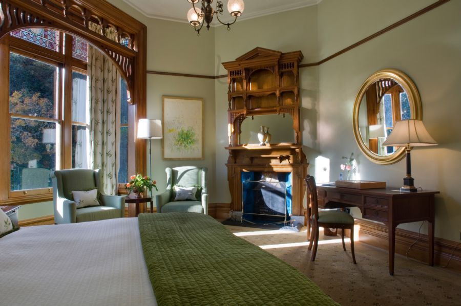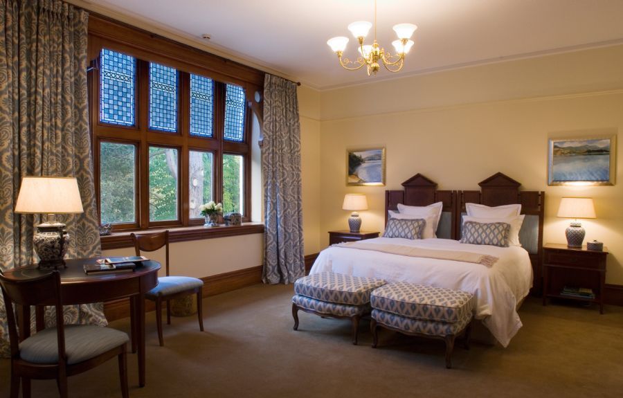 This suite with separate bedroom and living room is characterized by original artwork featuring scenes of the Canterbury region. A Colefax & Fowler plaid is highlighted throughout the suite and a decorative scheme reminiscent of the Arts & Crafts period features dark wood and classic furniture. The Butler Suite offers two bathrooms and a wood-burning fireplace.