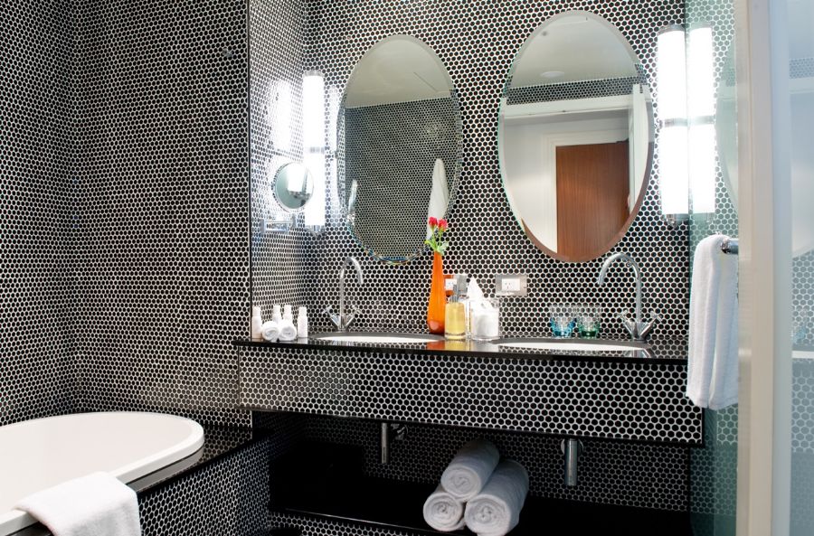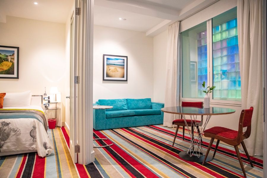 At Hotel DeBrett there are 24 spacious rooms and suites, each with its own distinctive style and mood. All feature our bespoke carpet, designed by Michelle Deery, hand woven from 100% New Zealand wool, it is a dominant feature throughout the rooms, and invites you to kick off your shoes and let your feet sink in. All bathrooms feature black penny round mosaic tiles which reference the original art deco honeycomb mosaics, and are complemented by the polished black granite floors, warmed by underfloor heating. Soft white walls and curtains create a backdrop for an eclectic mix of furniture, fittings and artwork collected by Michelle in her travels around New Zealand, and internationally, over a number of years.