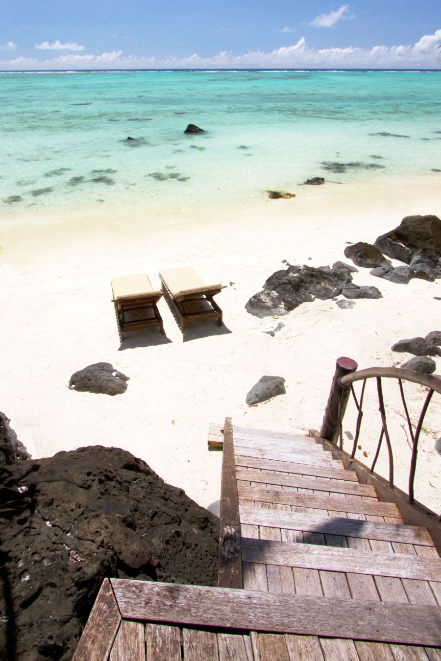 Pacific Resort Aitutaki’s Ultimate Beachfront Villas provide expansive luxury and secluded Aitutaki boutique accommodation. Your exquisitely designed Ultimate Beachfront Villa is an elevated sanctuary perched on spectacular black volcanic rock, with an outdoor staircase to the white sand beach below. Our three exclusive beachfront villas include sensational private, double sun decks and a beachside shower. Villas comprise bedroom and lounge room with air-conditioning, king size beds, IDD telephone, individual TV/DVD combo, CD stereo system, DVD player, iPod connecting cable, in-room safe, ceiling fans, hairdryer, mini bar, indoor shower with a view of a private garden as well as an outdoor garden shower.
