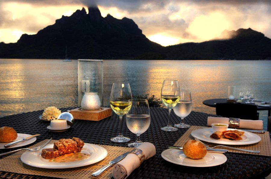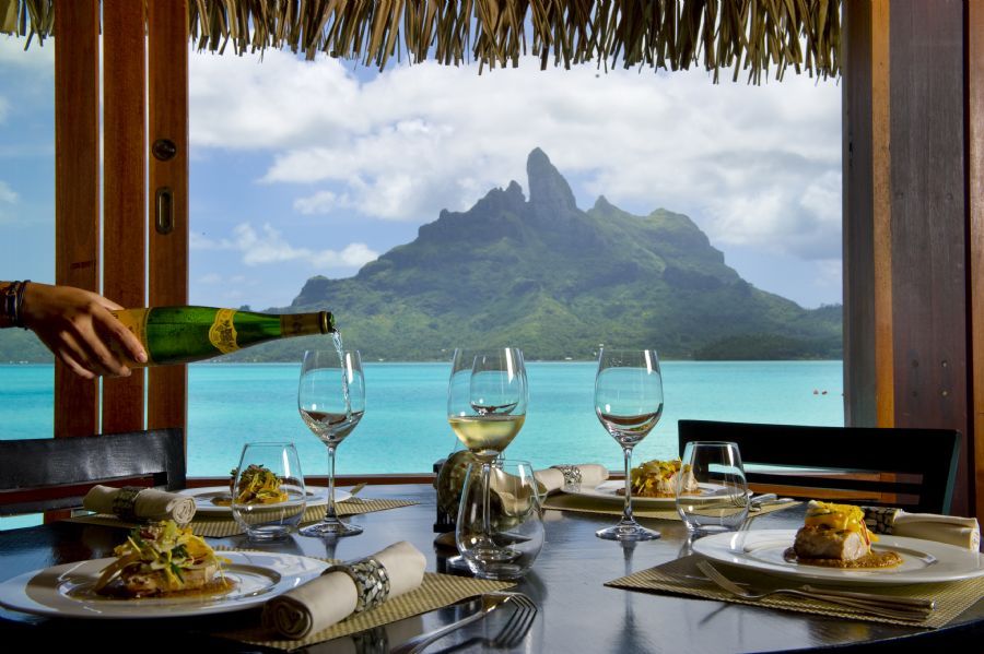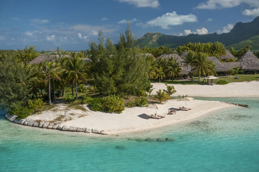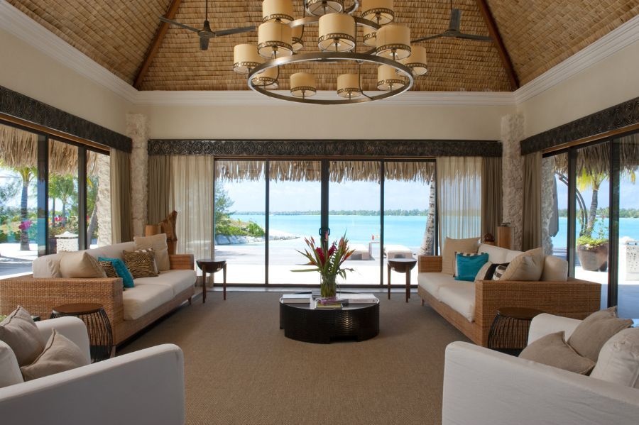 The nearest villas to the center islet of the hotel, visionary Overwater One-Bedroom Villas showcase Bora Bora’s crystalline lagoon from both outdoor terraces with dining gazebos and in-room glass viewing panels. A separate living room, serene bedroom, and spacious marble bathroom complement the stunning natural scene. (1,550-1,905 Square Feet / 144-177 Square Meters)