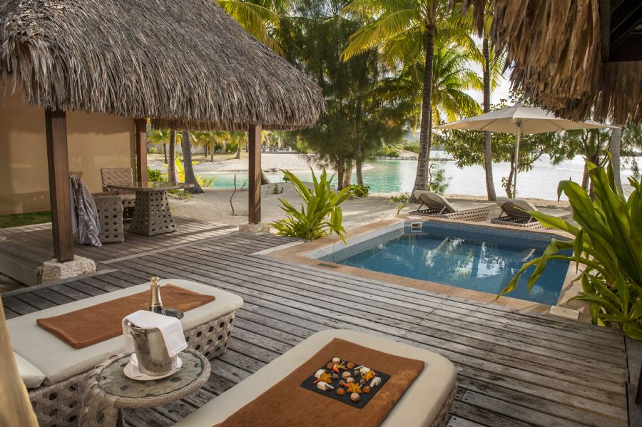 Continually captivating. With breathtaking views of the neighboring islands of Raiatea and Taha'a, our Royal Two-Bedroom Pool Villa unfolds into a private two-bedroom, two-bathroom haven adorned with signature Polynesian details and uncompromising amenities, and featuring its own private garden and infinity pool. (3,455 Square Feet / 321 Square Meters)